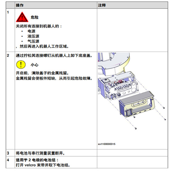 注意:當需要更換電池時,將會顯示電池低電量警告(38213 電池電量低)。建議在電池 更換完畢前保持控制器電源打開,以避免機器人不同步。 對于具有 3 電極觸點的 SMB 電路板(RMU101 3HAC044168-001 或 RMU102 3HAC043904-001),新電池的壽命通常是 36 個月。 對于具有2極電池觸點的SMB板,如果機械手斷電2天/周,新電池的通常壽命為36個 月;如果機械手斷電16小時/天,則為18個月。通過電池停機維護程序,可延長壽命 以延長生產中斷時間。